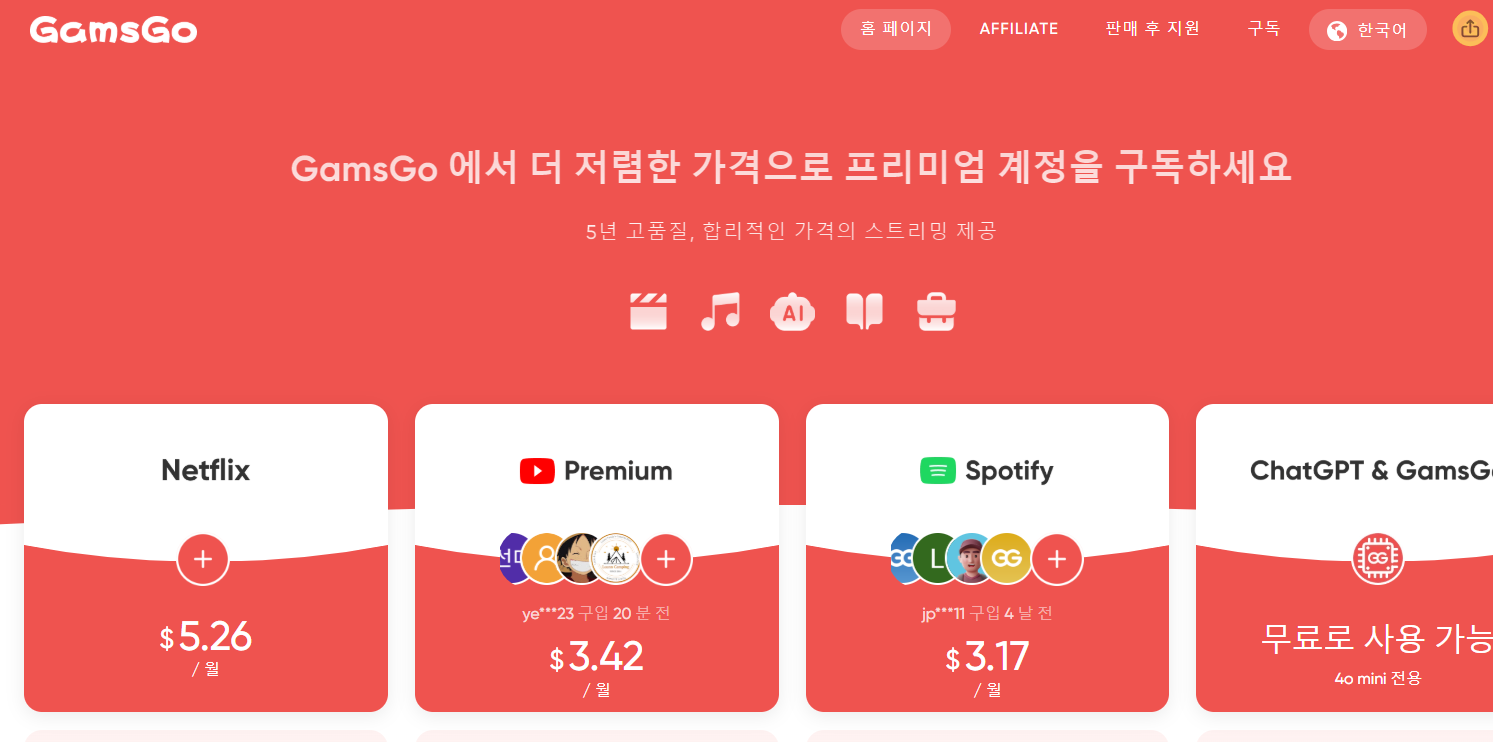겜스고는 유튜브 프리미엄뿐만 아니라 넷플릭스, 디즈니 플러스, 스포티파이 등 다양한 OTT 서비스를 저렴하게 제공합니다. 한 플랫폼에서 여러 구독 서비스를 관리할 수 있어 정말 편리해요.