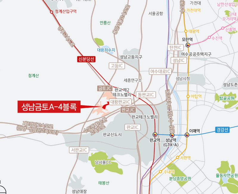 성남금토 A4 청약 단지는 판교테크노밸리와 가까운 위치에 있으며, 판교IC를 통해 강남으로의 접근성이 뛰어납니다. 직장인들이 선호하는 IT 중심의 업무지구인 판교의 중심지와 가깝다는 점이 큰 장점입니다.