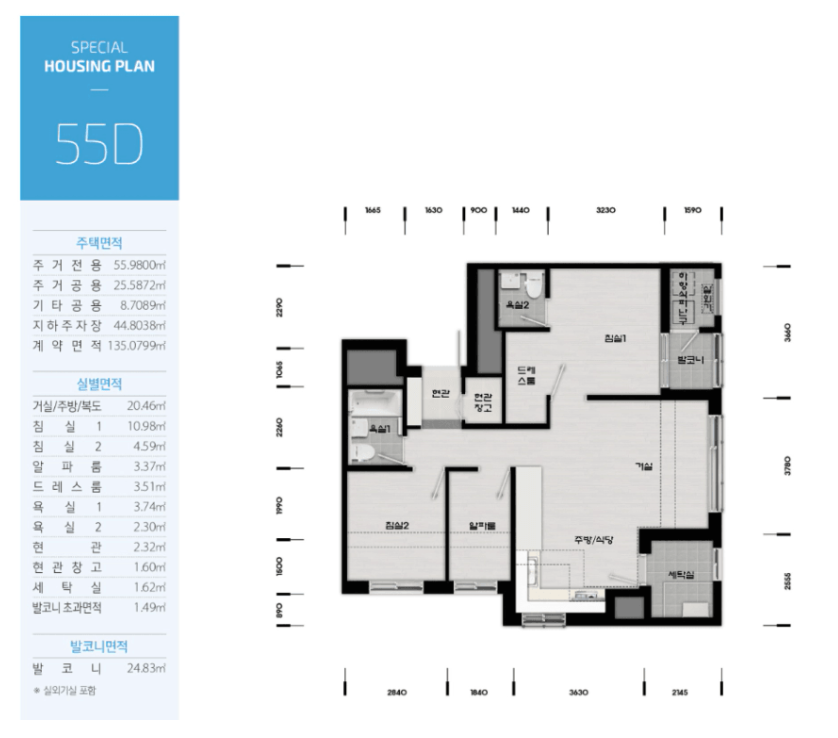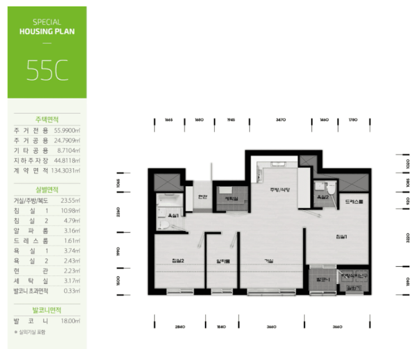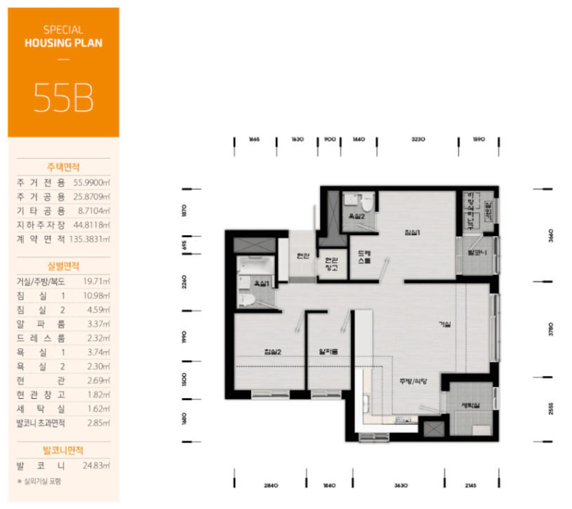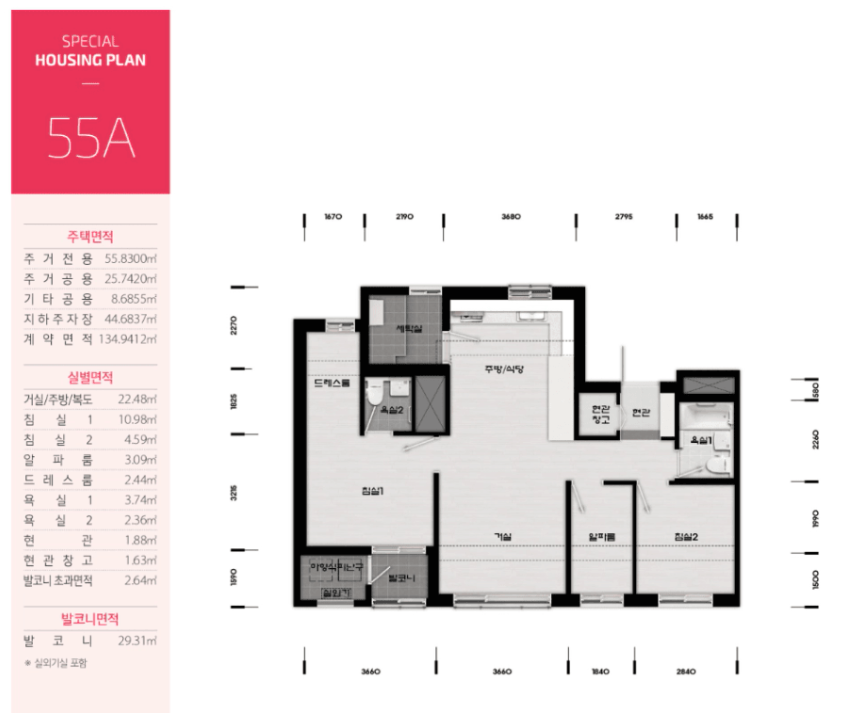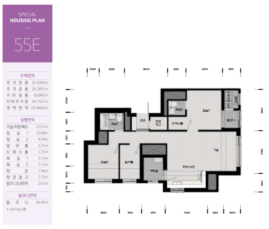 평면도는 55㎡ 단일 타입으로 구성되어 있지만, 내부 공간 활용이 뛰어나며, 실거주자들의 다양한 생활 패턴에 맞출 수 있도록 5가지로 구성되어 있습니다.