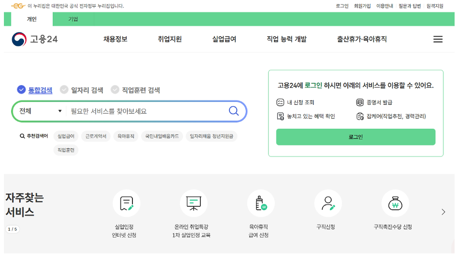 - 고용24 홈페이지에 접속하여 로그인합니다.