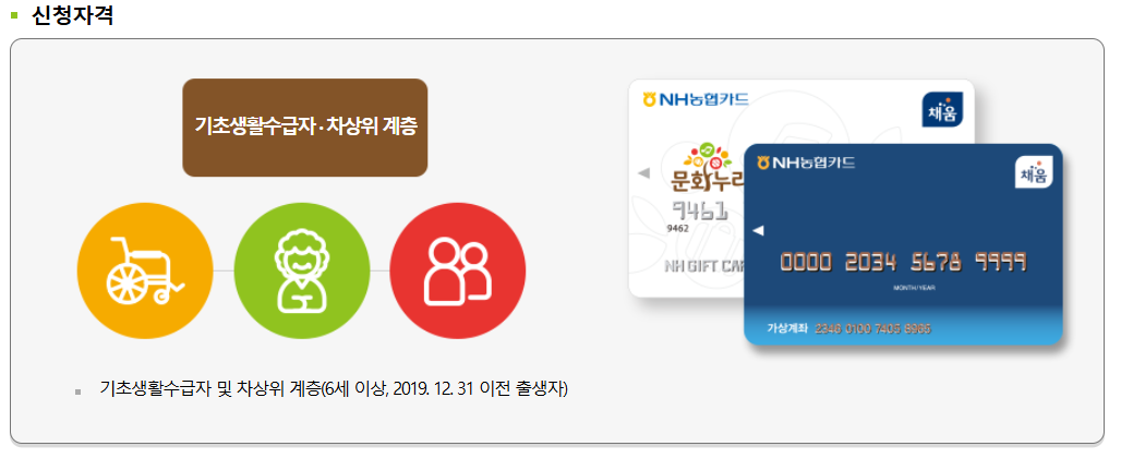 문화누리카드 발급 대상은 6세 이상(2019년 12월 31일 이전 출생자)인 기초생활수급자 및 차상위계층이에요.
