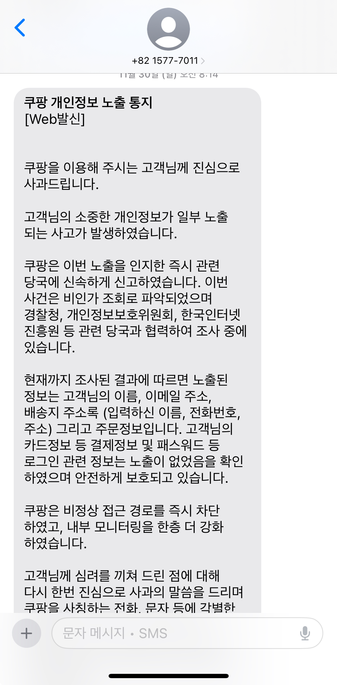 쿠팡은 유출 피해가 확인된 고객들에게 메시지를 보내고 있습니다. 아래의 메세지를 받았다면, 내 정보 중 어떤 부분이 유출되었는지 직접 확인할 수 있습니다.