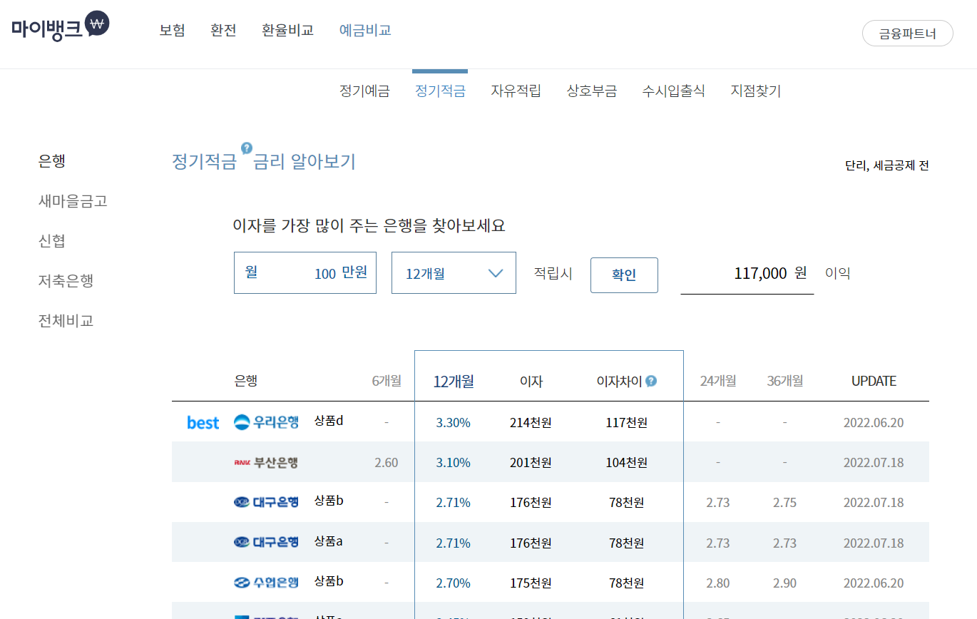 은행별, 지역별로 가입기간에 따른 이자율을 확인할 수 있습니다. 그래서 가장 높은 적금 상품을 찾아볼 수 있습니다.