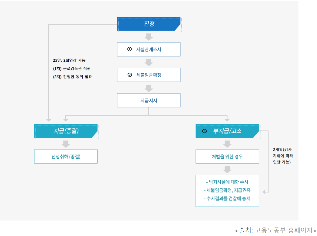 고용노동부 홈페이지 [민원마당]에서 온라인으로 [임금 체불 진정]을 제기하거나, 사업장 소재지 관할 고용노동관서 고객지원실을 방문하여 사전 상담 후 진정 또는 고소하실 수 있습니다.