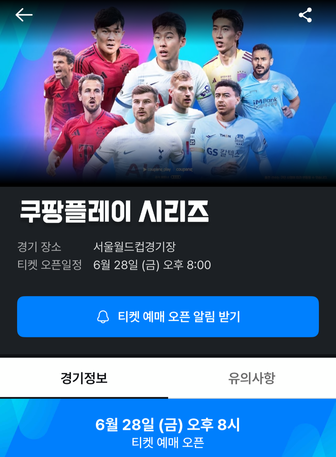 - 쿠팡플레이 앱에서 '티켓 예매 오픈 알림 받기'를 설정해두세요. 티켓팅 시간을 놓치지 않기 위해서입니다.