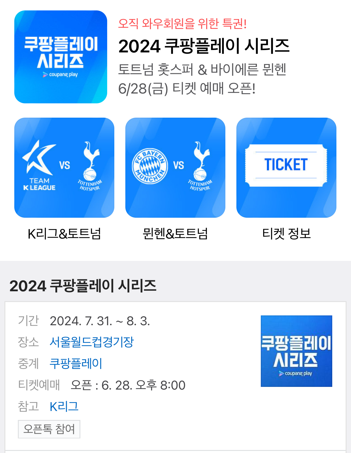 2024 토트넘 뮌헨 티켓팅 쿠팡플레이 시리즈 예매 가격