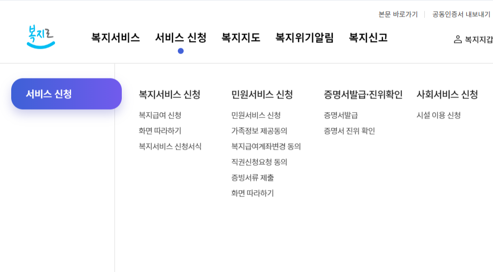 - 신청 홈페이지 복지로 누리집( www.bokjiro.go.kr) 접속