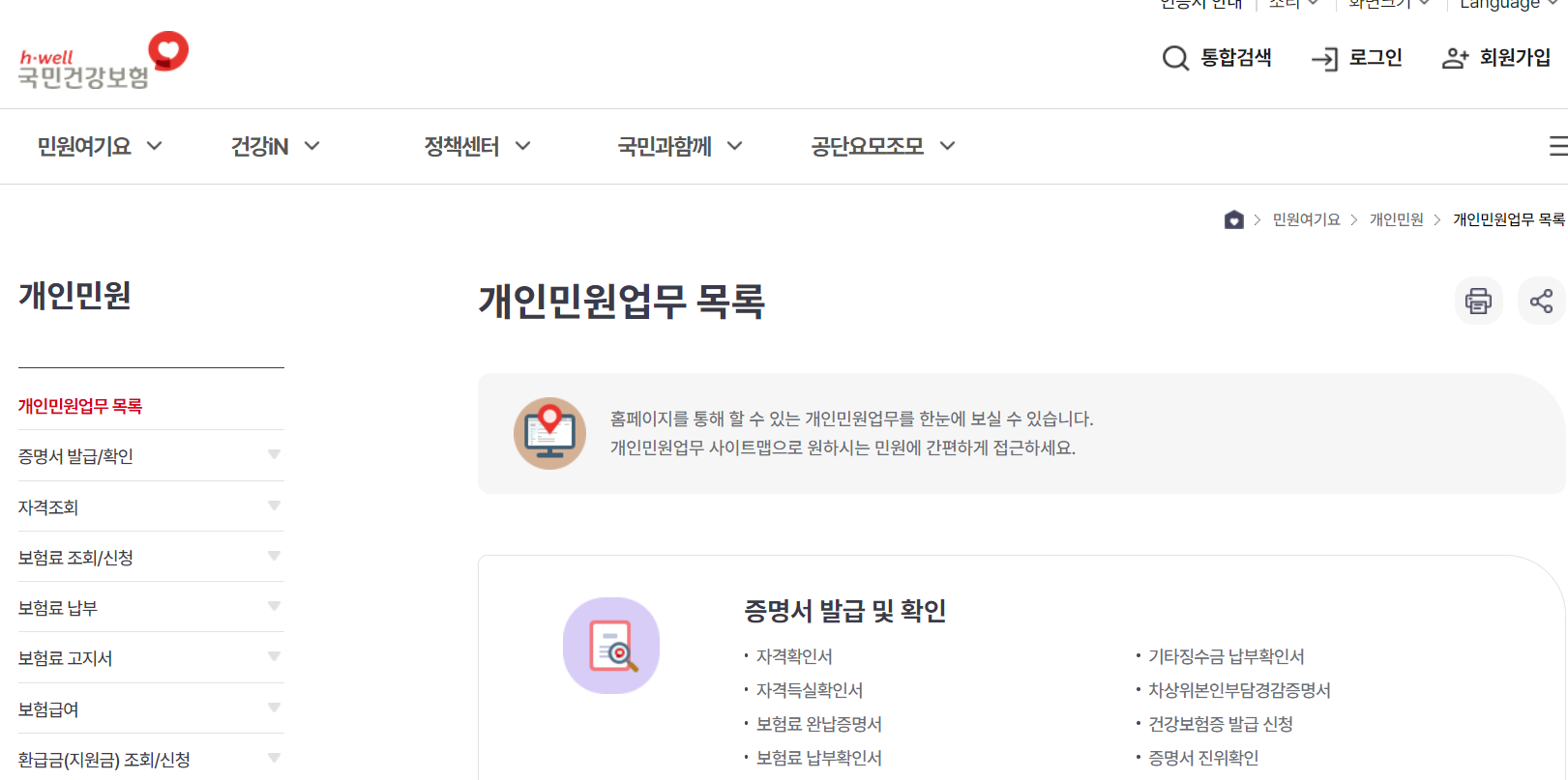 먼저, 포털사이트에서 '국민건강보험'을 검색하여 공단 홈페이지에 접속합니다. 그 후, 간편인증이나 공동, 금융인증서를 통해 로그인한 뒤, '민원여기요' 메뉴에서 '개인민원'을 선택합니다.