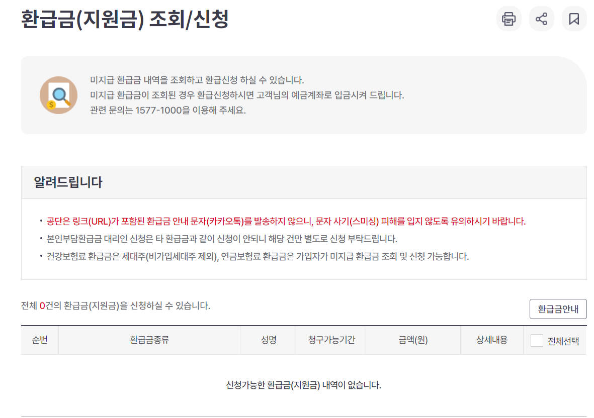 국민건강보험 환급금 조회 후, 환급액이 있는 경우 상세 내역과 금액을 확인할 수 있으며, 하단의 '신청하기' 버튼을 통해 환급금을 신청할 수 있습니다. 환급금이 없는 경우에는 환급 내역이 없다고 표시되며, 이때에는 추가로 환급금을 받을 가능성이 있는지 다시 한번 확인해 보는 것이 좋습니다.