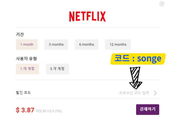이후 원하는 구독 기간(1개월, 3개월, 6개월, 12개월)을 선택하고, 할인 코드 'songe' 를 입력하면 추가 할인을 받을 수 있습니다.